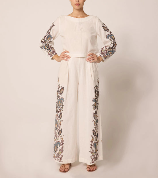 In a cotton linen blend, the Martin Pant is a wide leg trouser with a relaxed fit and side seam zipper for easy wear. The placed print along each leg creates a flattering silhouette. Pair it with the Georgia Blouse.