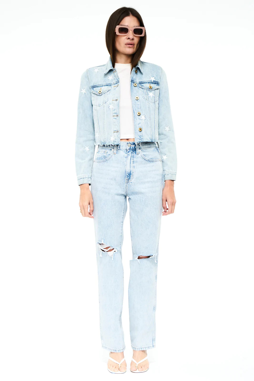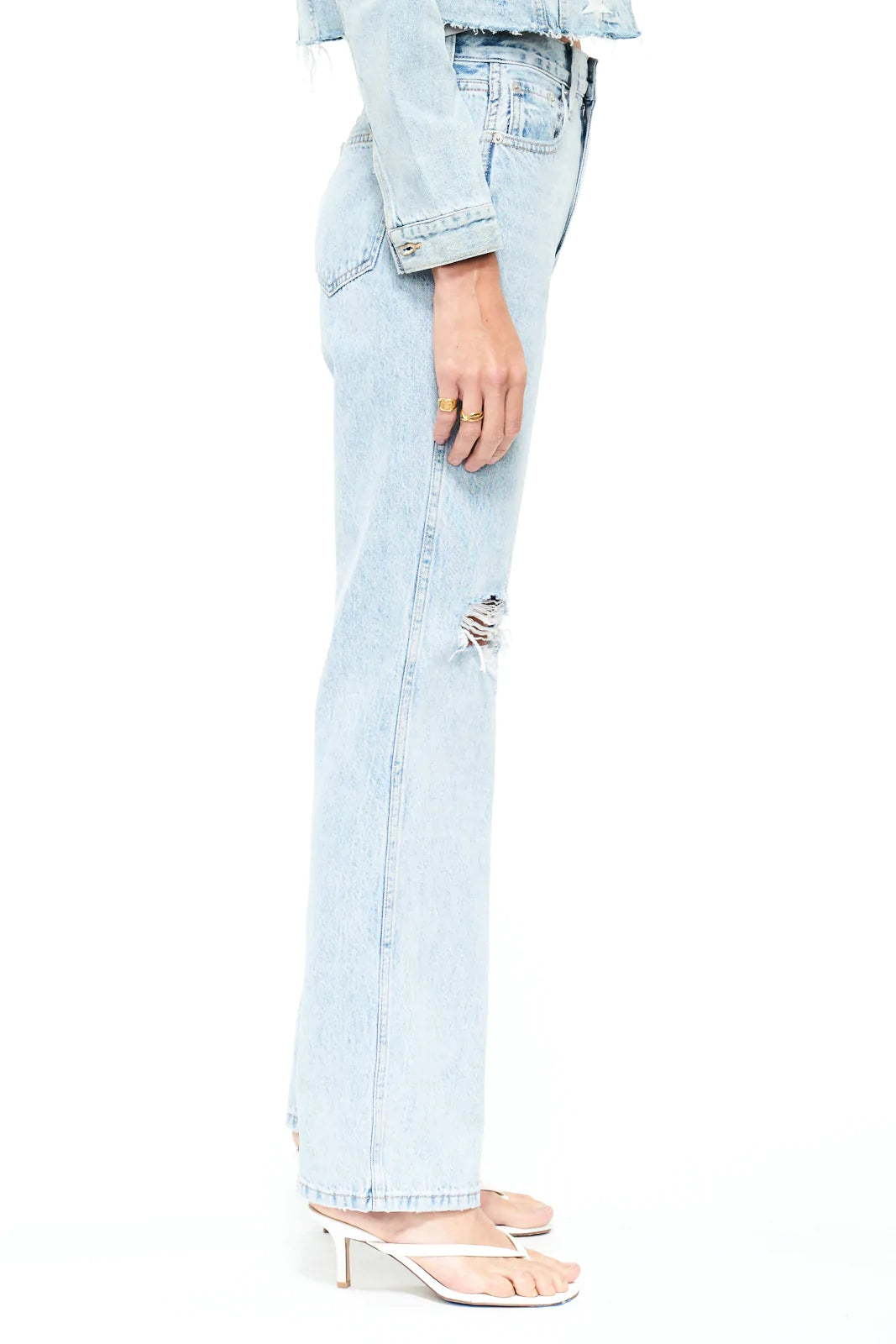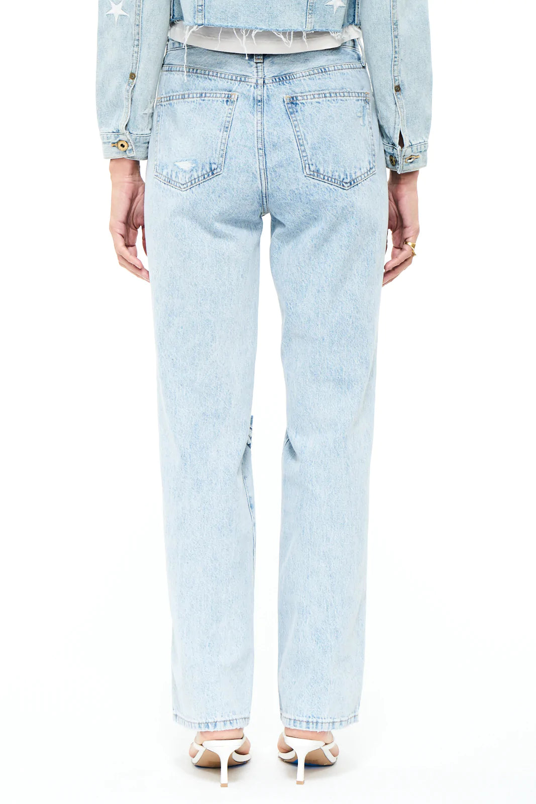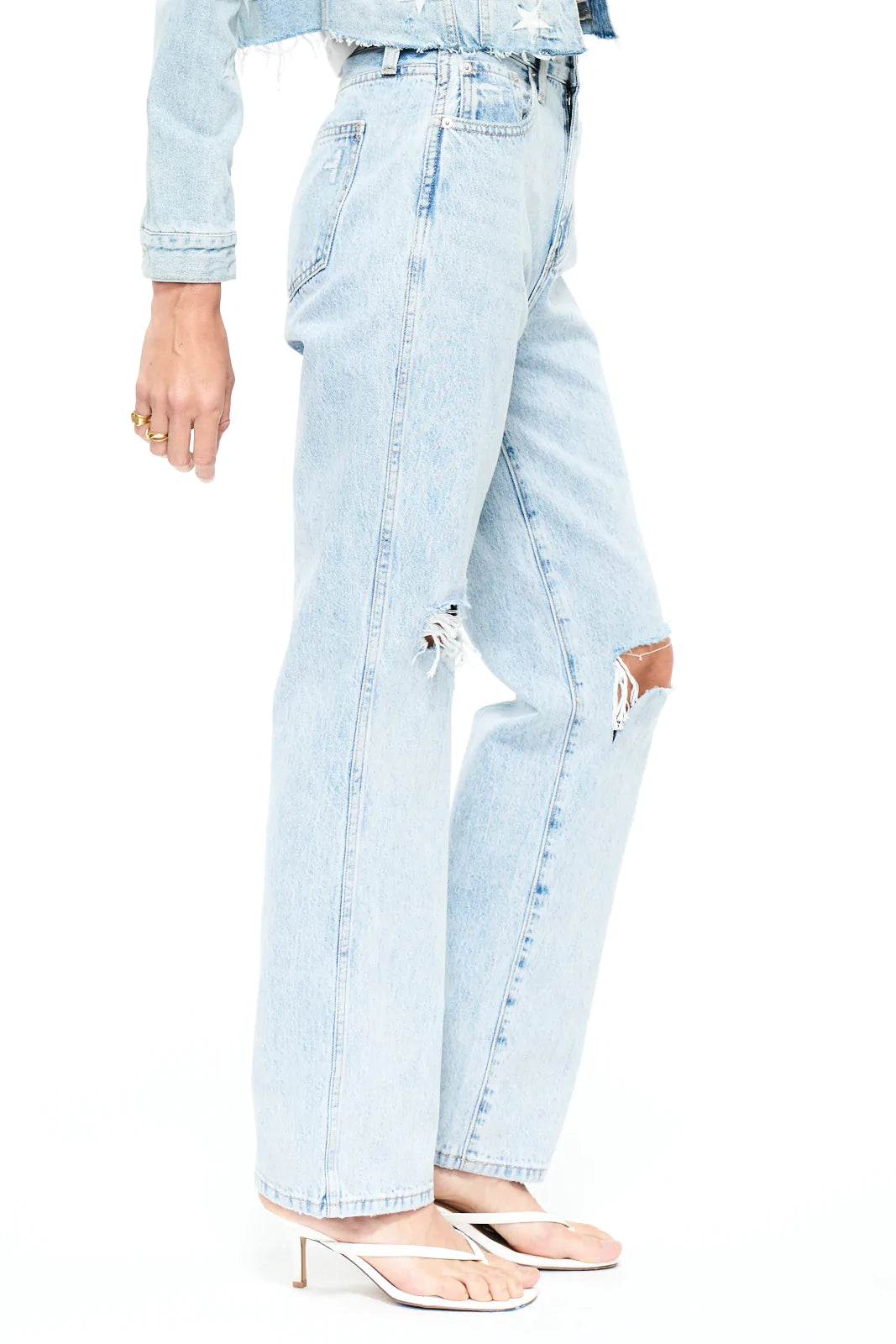 description || The Cassie is a super high rise straight leg that hugs your waist and is relaxed throughout :: This carefree style hits above the ankle and comes in a vivid light blue wash with classic knee holes