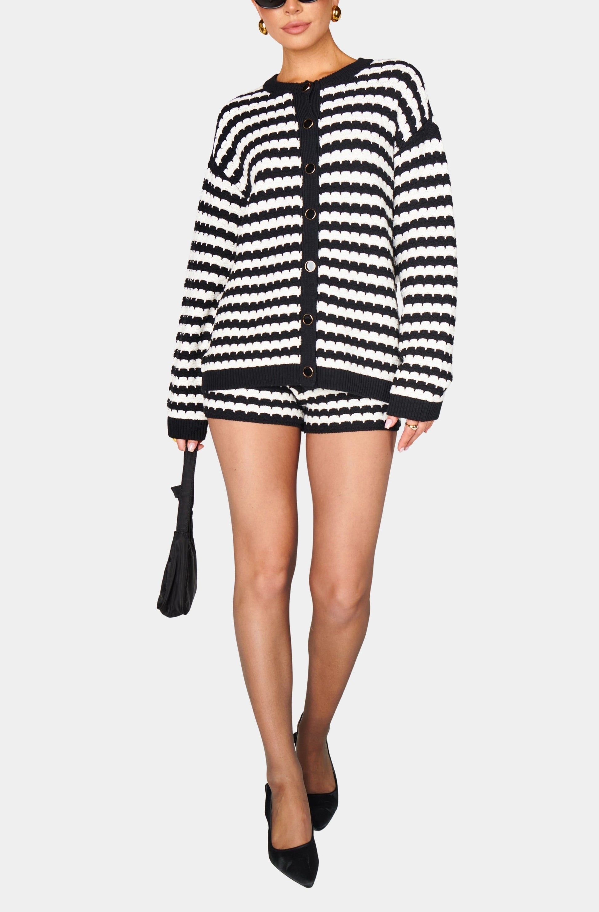 Step up your shorts game with these trendy striped knit shorts! With an easy elastic waistband and laid-back fit, they’re as comfy as they are cute. Pair with the matching sweater for a cool, coordinated look that’s cozy every time you wear it.