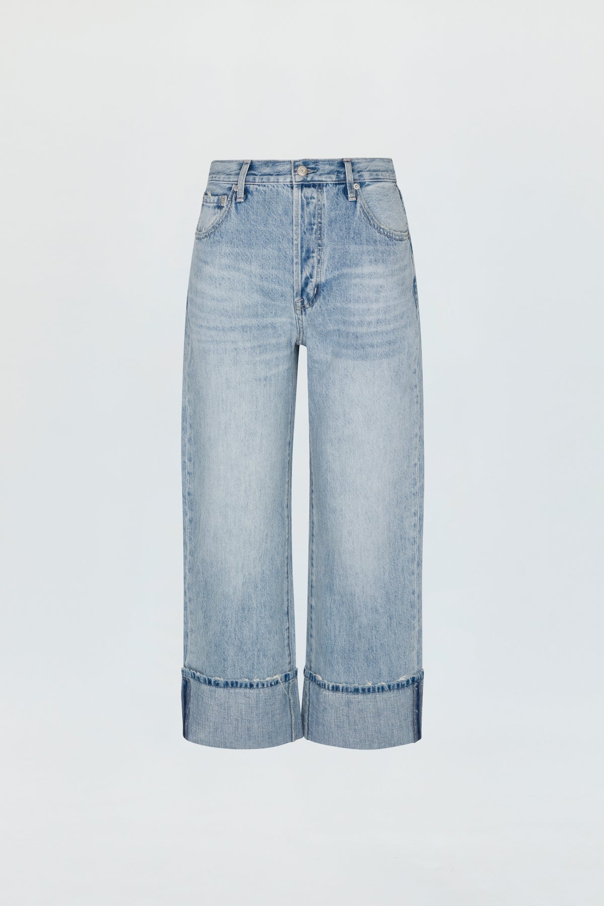 High-Rise Wide Leg Jeans in Essex Vintage. Meet your new favorite jeans. These high-rise jeans feature a relaxed, wide-leg fit, an oversized cuffed ankle hem, and are crafted from rigid, lightweight denim for a vintage-inspired look and feel. The Essex wash offers the perfect balance of light blue denim with vintage fading and whiskering.